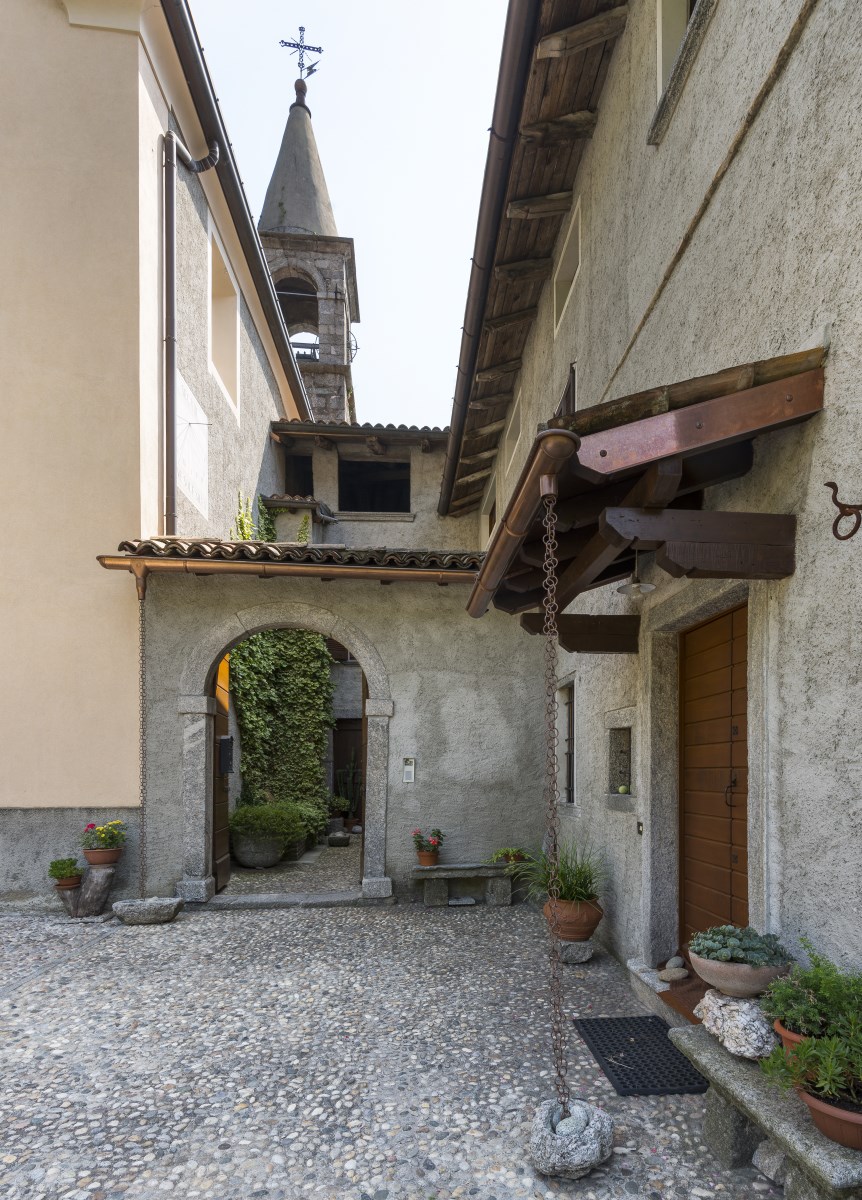 facciata, un portone conduce al cortile di quella che era la casa parrocchiale.